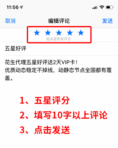 只要参与App Store五星好评,发送10字以上评论。并将好评截图发送至花生代理官方客服,即可获得2天VIP兑换码。